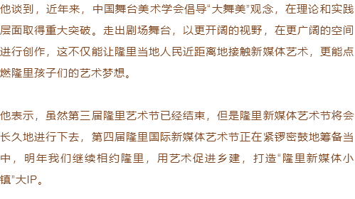 雖然第三屆隆里藝術(shù)節(jié)已經(jīng)結(jié)束,但是隆里新媒體藝術(shù)節(jié)將會長久地進行下去,第四屆隆里國際新媒體藝術(shù)節(jié)正在緊鑼密鼓地籌備當(dāng)中,明年我們繼續(xù)相約隆里,用藝術(shù)促進鄉(xiāng)建,打造“隆里新媒體小鎮(zhèn)”大IP。