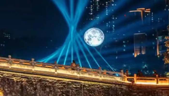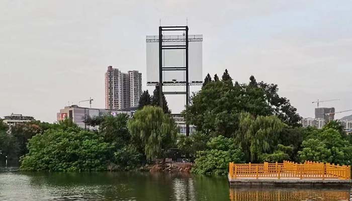 月亮升降裝置設置于郴州北湖湖中的島上,用于在夜間表現“明月高懸”的美麗景觀。該裝置主要由支撐結構、戶外LED網格屏、升降裝置、電氣控制、支撐柱基礎組成。戶外LED網格屏夜間顯示月亮圖案,可通過升降裝置提升到26米的高度,呈現出月亮當空懸掛的效果,展示完畢后,可通過卷揚系統將LED屏降至地面。該項目由我公司設計制作,目前已投入參與演出,得到廣大觀眾的認可,喜愛。