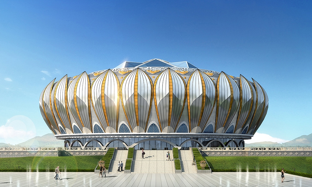達茂聯合旗演藝中心占地面積7090平方米,總建筑面積11595平方米(其中,地下一層建筑面積3135平方米;地上一層建筑面積2543平方米;地上二層建筑面積2378平方米;地上三層建筑面積2106平方米;地上四層建筑面積2106平方米;地上四層建筑面積1433平方米),共五層(包括地下一層),鋼筋混凝土框架結構。功能分區主要由演藝廳、電影廳、放映機房、排練廳、化妝師等區域。建筑外立面采用蓮花瓣狀,以灰色為主,黃色相間的花崗巖。該項目舞臺設備(舞臺機械、燈光音響、座椅)由我公司設計、安裝、調試,并竣工驗收。
